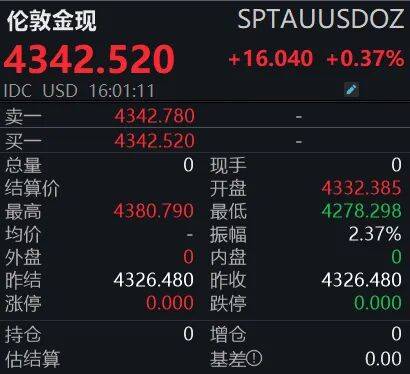 截至记者发稿,伦敦金现报4342.52美元/盎司,日内涨0.37%,盘中最高触及4380.79美元/盎司,再创历史新高。