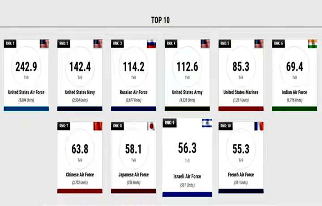 由于美国人将这个排名的前几名都给了自己国家的航空兵军种,那么若将美国各军种航空力量合并计算,就是美国第一,俄罗斯第二,而印度空军便顺势“跻身”第三,中国空军只能屈居第四。