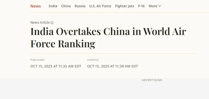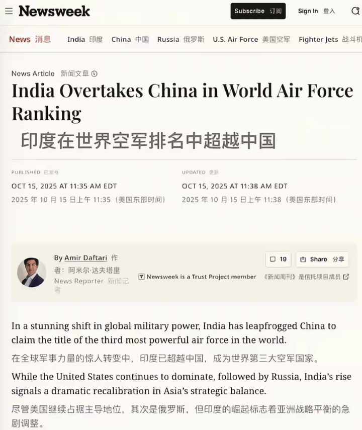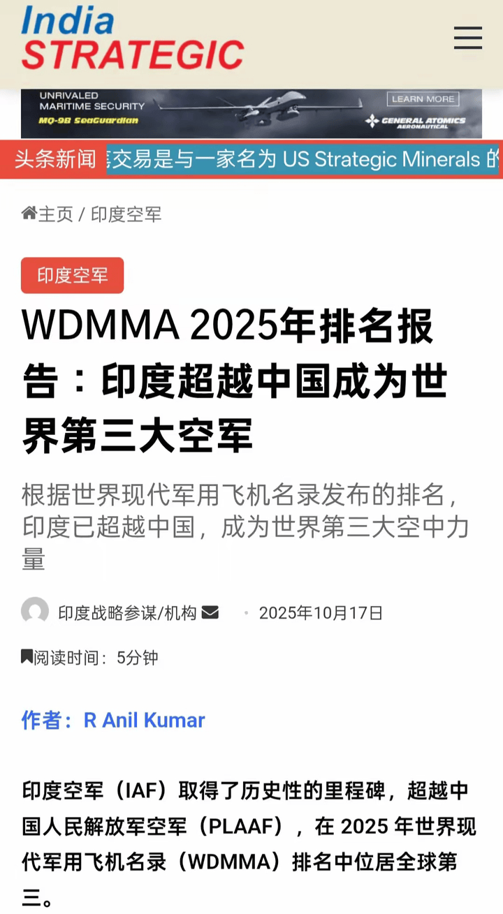 消息来源:环球网10月17日报道《印媒:印度空军排名世界第三,已经超越中国》