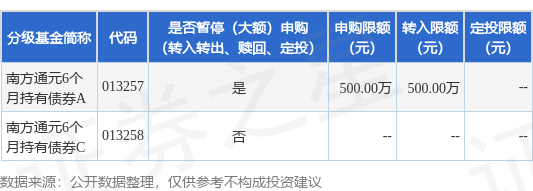 证券之星消息,10月18日南方基金管理股份有限公司发布《南方通元6个月持有期债券型证券投资基金A类份额限制大额申购、定投和转换转入业务的公告》。公告中提示,为保护基金份额持有人的利益,自2025年10月18日起南方通元6个月持有期债券型证券投资基金A类份额限制大额申购、定投和转换转入业务,申购、转换转入上限金额为500.0万元,下属分级基金调整明细如下:
