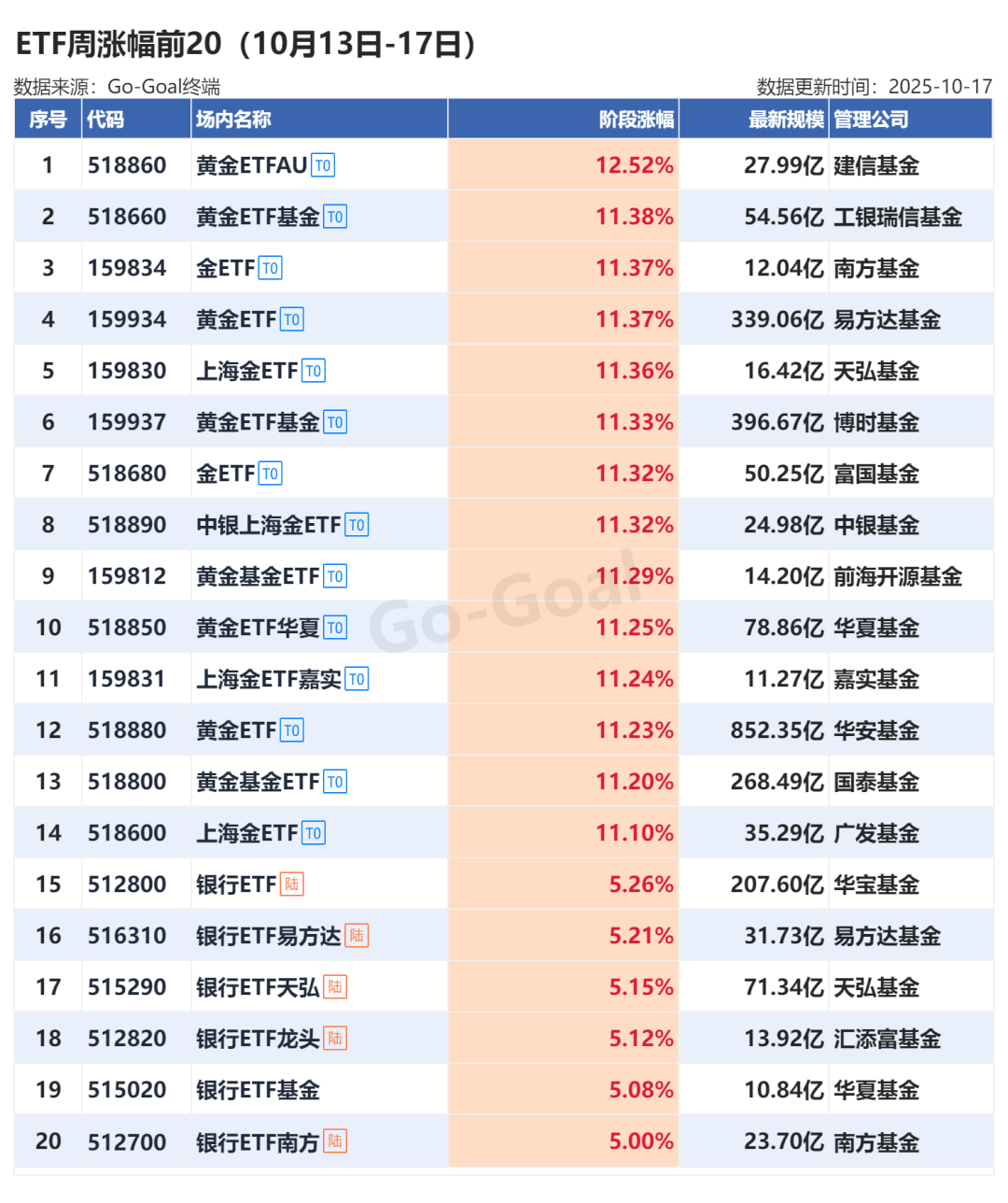 黄金ETF本周涨幅居前 ETF... Go-Goal ETF数据显示,多只黄金ETF本周涨幅较前,其中黄金ETFAU上涨12.52%,涨幅...