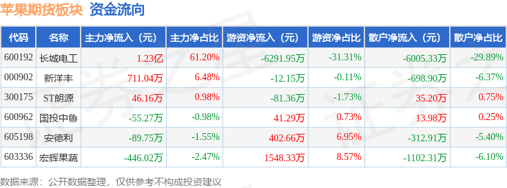 从资金流向上来看,当日苹果期货板块主力资金净流入1.25亿元,游资资金净流出4393.19万元,散户资金净流出8070.26万元。苹果期货板块个股资金流向见下表: