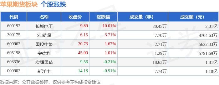 证券之星消息,10月20日苹果期货板块较上一交易日上涨1.19%,长城电工领涨。当日上证指数报收于3863.89,上涨0.63%。深证成指报收于12813.21,上涨0.98%。苹果期货板块个股涨跌见下表: