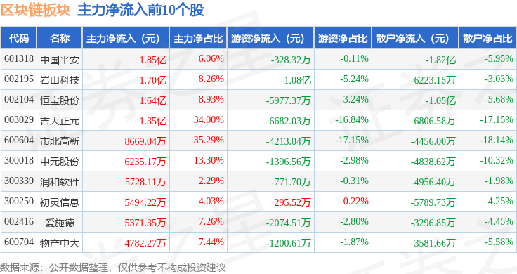 从资金流向上来看,当日区块链板块主力资金净流出16.88亿元,游资资金净流入1264.6万元,散户资金净流入16.75亿元。区块链板块个股资金流向见下表: