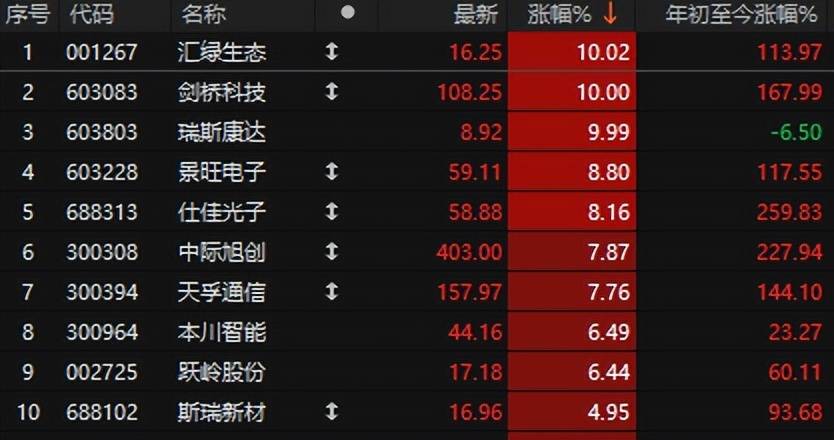 今天A股光模块板块反弹,汇绿生态、剑桥科技、瑞斯康达涨停,中际旭创大涨7.87%。
