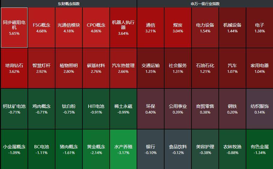 最后简单看下盘面,截至收盘,上证指数涨幅为0.63%,创业板指涨幅为1.98%,港股恒生指数涨幅为2.42%,恒生科技指数涨幅为3%。分行业来看,通信、煤炭、电力设备、机械设备、电子等行业领涨,有色金属、农林牧渔、美容护理等行业领跌。