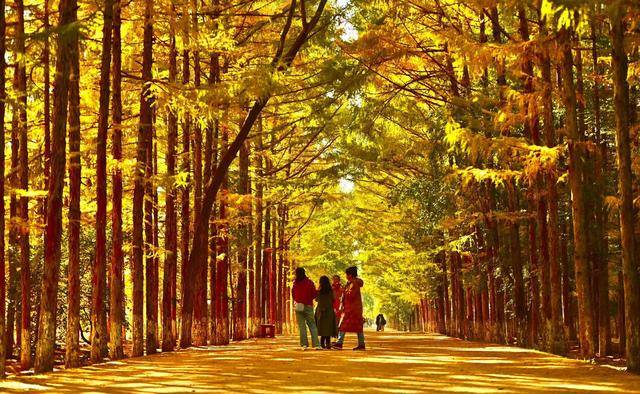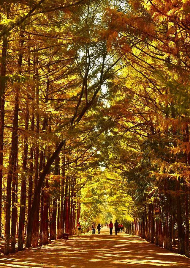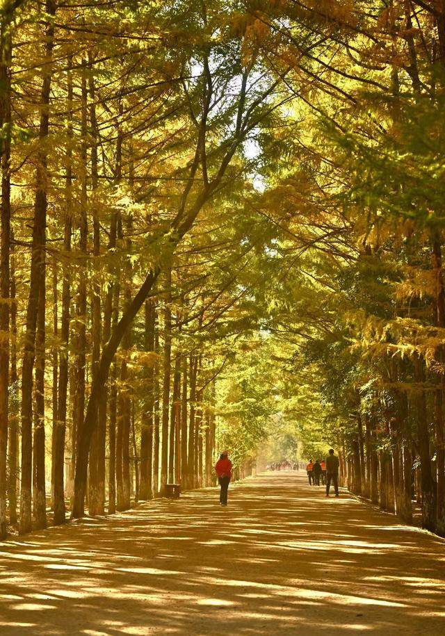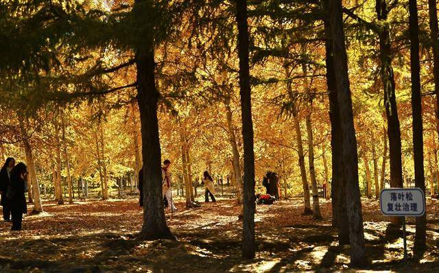 脚下,偶尔飘落的“金色”松针,铺成细碎的“金毯”,踩上去发出轻柔的“沙沙”声;身旁,市民们或举着手机定格美景,或带着孩子追逐飘落的叶片,或与家人并肩漫步,享受难得的秋日闲暇。摄影爱好者则扛着相机穿梭其间,寻找光线与金叶的最佳结合点,试图将这份秋日美景永久留存。