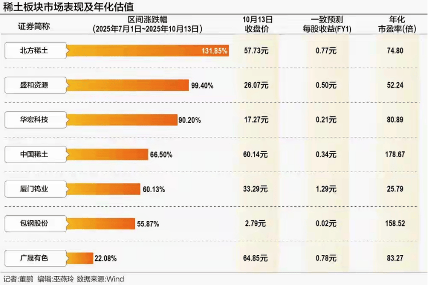 以北方稀土为例,按照当时管制政策时间前后,假设截至13日收盘的数据计算,该公司年内涨幅超过170%,如果按照全年28亿元的卖方盈利预期值估算,公司当前估值已经达到75倍。