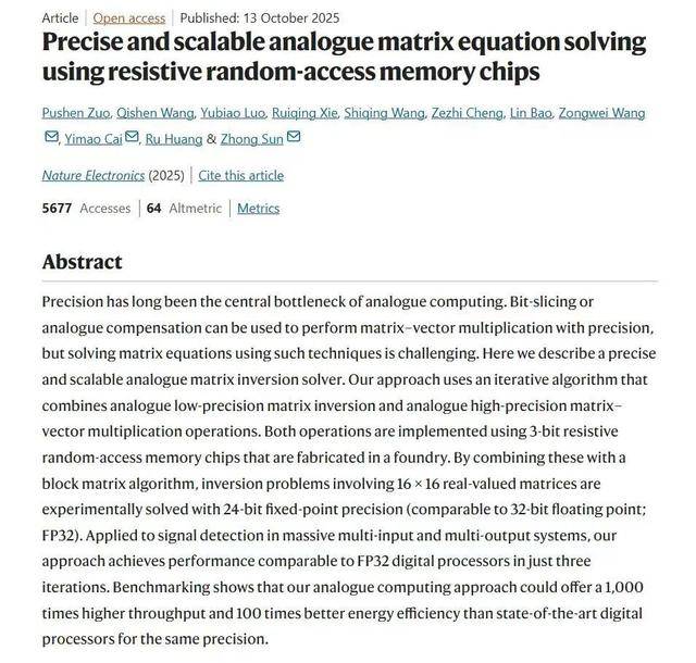 在计算精度方面,团队在实验上成功实现16×16矩阵的24比特定点数精度求逆,矩阵方程求解经过10次迭代后,相对误差可低至10⁻⁷量级。在计算性能方面,在求解32×32矩阵求逆问题时,其算力已超越高端GPU的单核性能;当问题规模扩大至128×128时,计算吞吐量更达到顶级数字处理器的1000倍以上,传统GPU干一天的活,这款芯片一分钟就能搞定。