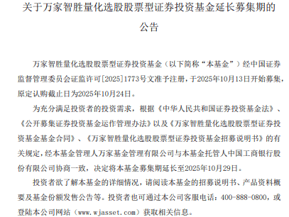 公告称,万家智胜量化选股股票型证券投资基金经中国证券监督管理委员会证监许可[2025]1773号文准予注册,于2025年10月13日开始募集,原定认购截止日为2025年10月24日,现决定将该基金募集期延长至2025年10月29日。