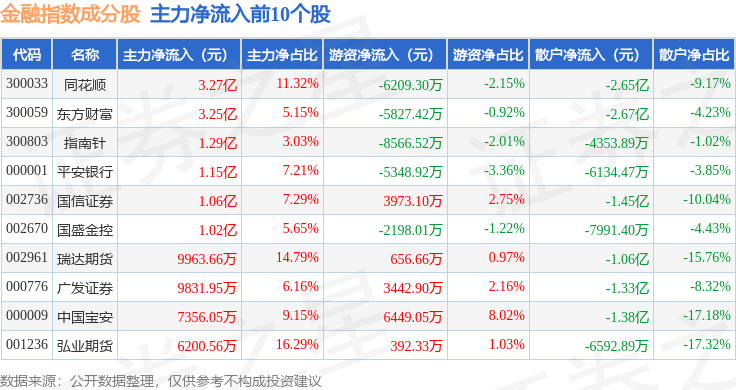 资金流向方面,金融指数(399240)成份股当日主力资金净流入合计11.15亿元,游资资金净流出合计5533.33万元,散户资金净流出合计10.6亿元。成份股资金流向详情见下表:
