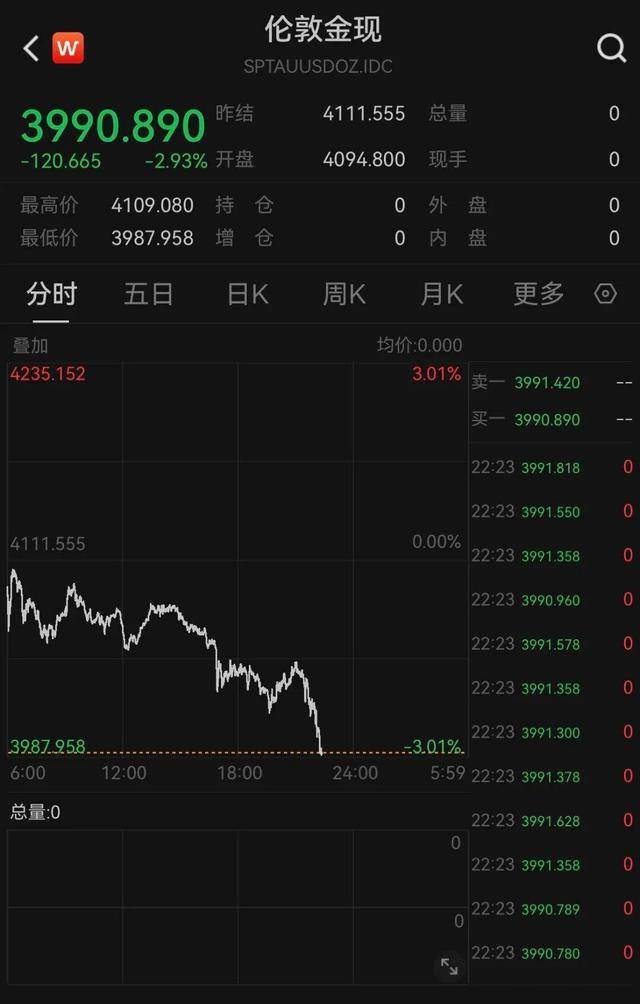 北京时间10月27日晚间,伦敦现货黄金盘中跌破4000美元/盎司,截至发稿,最低触及3987美元/盎司,日内跌幅扩大至2.8%。现货白银跌超4%,报46.5美元/盎司。