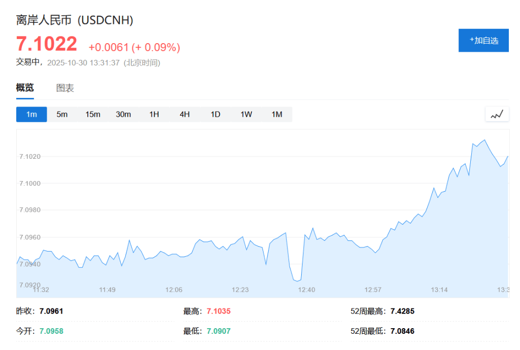 离岸人民币变动不大,最新报7.1022元兑1美元。 在岸人民币变动不大,最新报1美元兑7.0970元人民币。