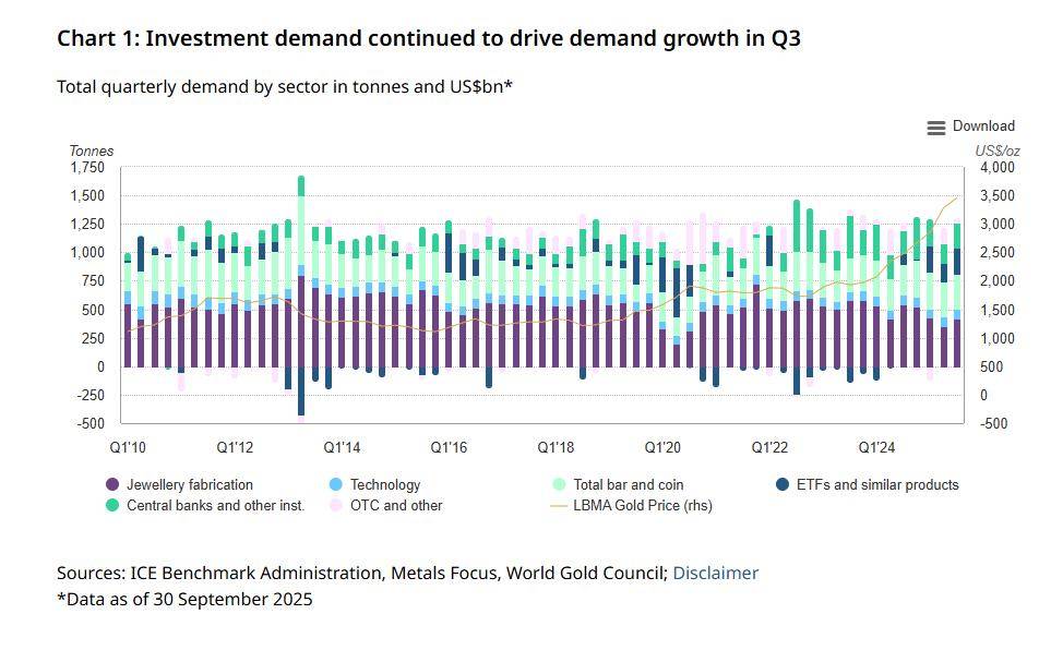 世界黄金协会(称WGC)周四表示,受投资需求激增推动,2025年第三季度全球黄金需求同比增长3%,达到1313吨,创下历史最高季度需求纪录。