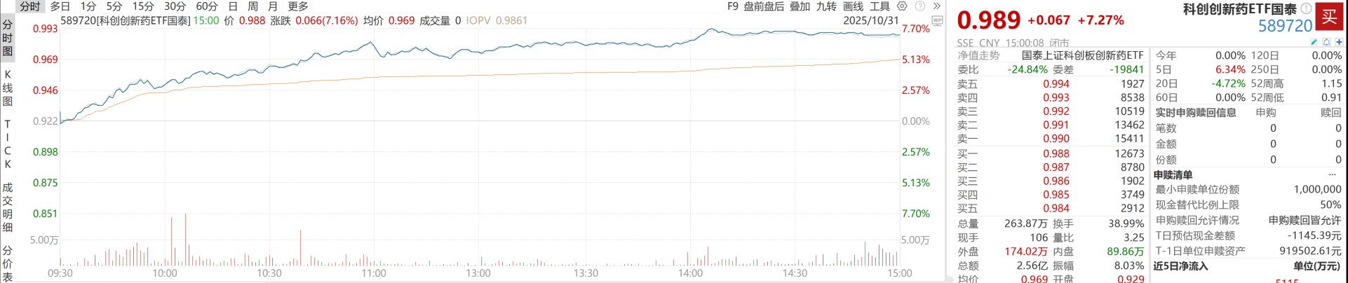 科创创新药ETF589723,跟踪的是上证科创板创新药指数,指数以biotech为主,精选科创板头部创新药企,呈现出比较鲜明的中小市值特性,研发费用占比更高,创新纯度更高。从历史表现来看,2024“9·24”20256月科创板创新药指数的反弹力度比大盘更强,也能够明显超过同类的医药指数,或有助于在反弹阶段及市场风险偏好回升时更好地分享科创板弹性。