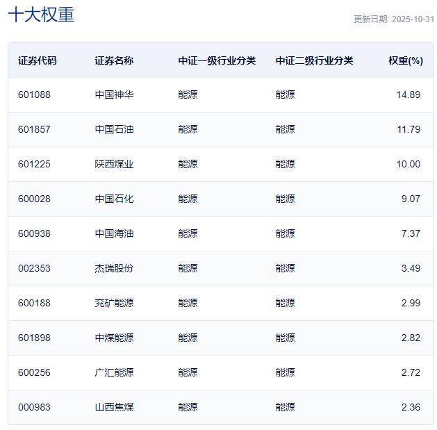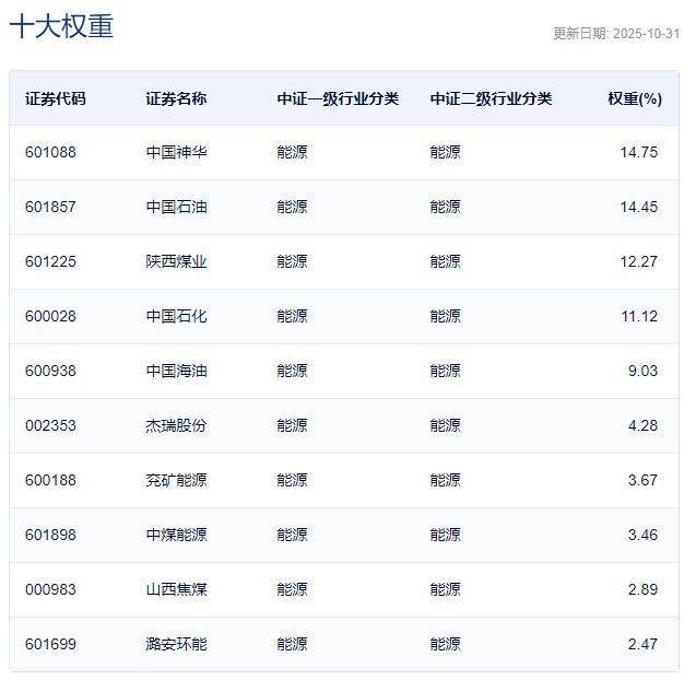 中证全指能源指数主要权重股