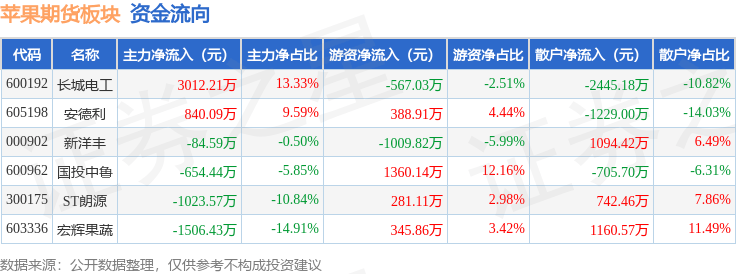 从资金流向上来看,当日苹果期货板块主力资金净流入583.27万元,游资资金净流入799.17万元,散户资金净流出1382.44万元。苹果期货板块个股资金流向见下表: