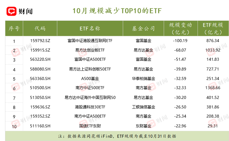 10月资金正从成长风格与特定赛道集体撤离。富国中证港股通互联网ETF规模锐减超百亿,易方达创业板ETF和科创板50ETF也分别遭遇超过68亿和39亿的净流出,反映了在市场调整期,投资者面对此前已有较高涨幅的港股科技、创业板及科创板等资产,选择落袋止盈。