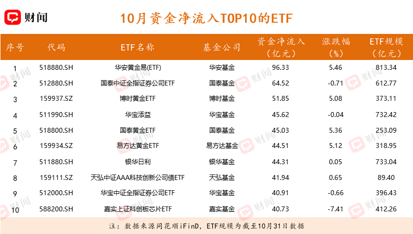 10月ETF市场的资金流向呈现出显著的避险与结构调仓特征。资金流入端,避险资产成为最大赢家,华安黄金易ETF(518880.SH) 以96.33亿元的巨额净流入高居榜首,其价格亦上涨5.46%,显示出在市场波动中投资者对黄金的强烈配置需求。