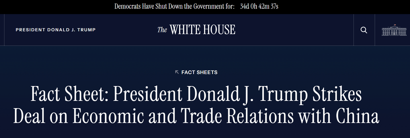 其中,美国白宫宣布,中国将有效暂停对稀土金属元素和其他关键矿产的额外出口管制,并终止针对美国半导体供应链相关企业的反垄断及反倾销调查。