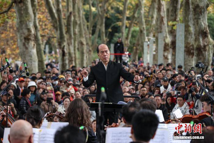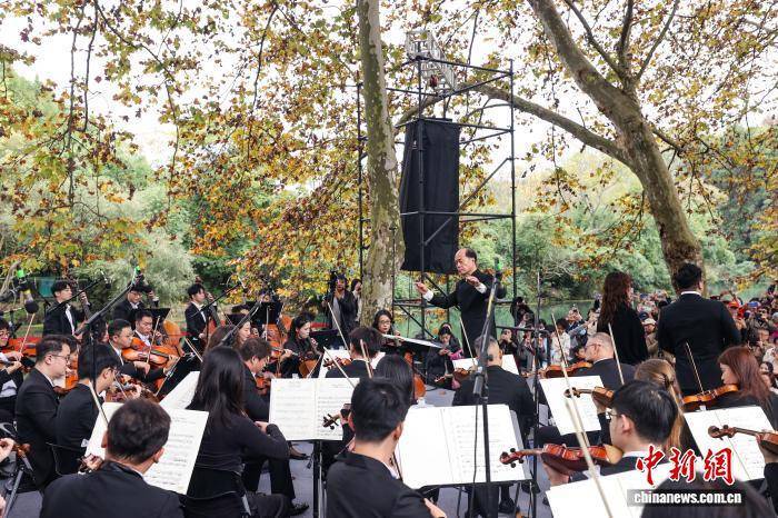 11月4日,贵阳交响乐团在贵州省贵阳市花溪区花溪河畔的“黄金大道”举行交响音乐会,演奏及演唱了多首耳熟能详的经典曲目,为现场观众带来一场户外视听盛宴。图为指挥家张国勇执棒贵阳交响乐团。中新社记者 瞿宏伦 摄