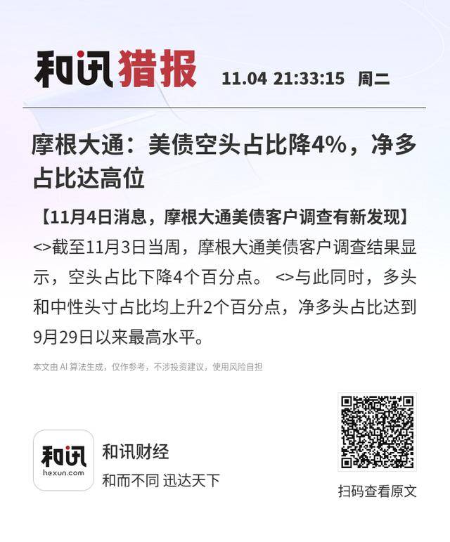 【11月4日消息,摩根大通美债客户调查有新发现】截至11月3日当周,摩根大通美债客户调查结果显示,空头占比下降4个百分点。>与此同时,多头和中性头寸占比均上升2个百分点,净多头占比达到9月29日以来最高水平。>
