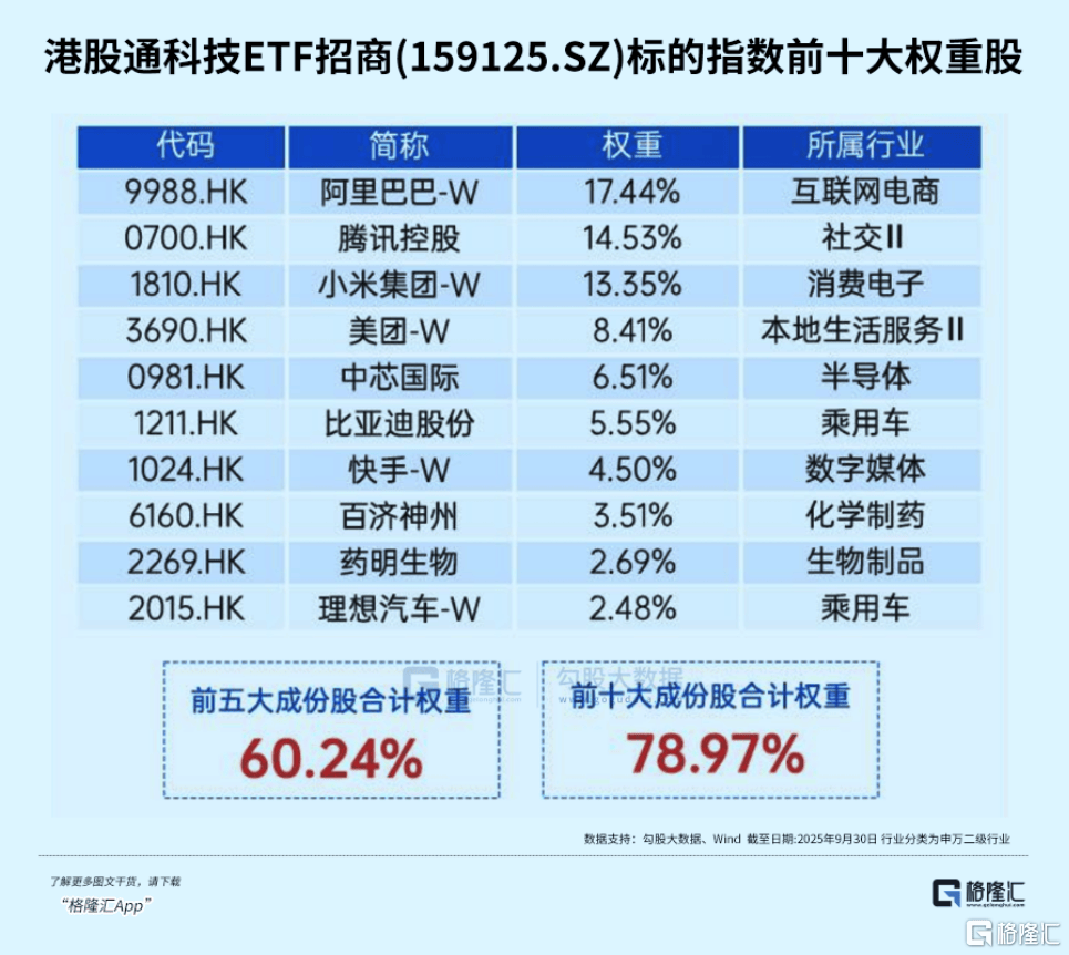 以聚焦硬科技和新经济的国证港股通科技指数为例,前十大成份股包括腾讯控股、小米集团、阿里巴巴、美团、中芯国际、比亚迪股份、百济神州等各个细分领域“尖子生”,权重合计79%,集中度高。