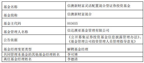 中国经济网北京11月10日讯 近日,信达澳亚基金公告,李德清离任信澳优享债券、信澳新财富混合、信澳恒盛混合、信澳鑫裕6个月持有期债券、信澳稳宁30天滚动持有债券、信澳鑫瑞6个月持有期债券。
