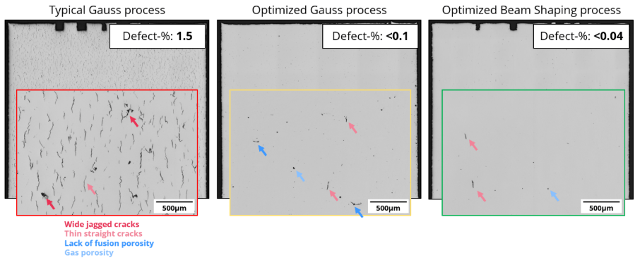 通过光束整形,可以改变强度分布,从而形成不同类型的熔池几何形状,能够在高功率和常规层厚下保持半圆形或扁平状的熔池形状。更平坦的熔池能够使凝固沿成型方向更加定向,从而避免熔池中心取向错误的凝固前沿发生碰撞。这使得成型后的样品裂纹密度极低。