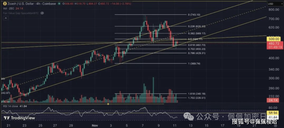 ZEC 这个M顶还挺标准的,近期少有的还给次顶逃命机会的标的了,ZEC在11月10日进行二次测试后放量下跌,当天下跌成交量明显大于此前的上涨成交量,这是明显的主力出货信号,进一步验证了ZEC已经见顶了。 不过ZEC有可能在20日均线得到短暂支撑,预期 $ZEC 回踩 $400 ~ $350 能反弹一波,而这次反弹则是空单加仓的时机。