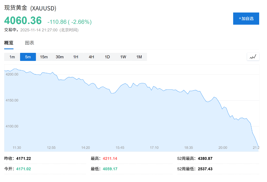 现货黄金回落至4080美元/盎司下方,日内跌2.21%。