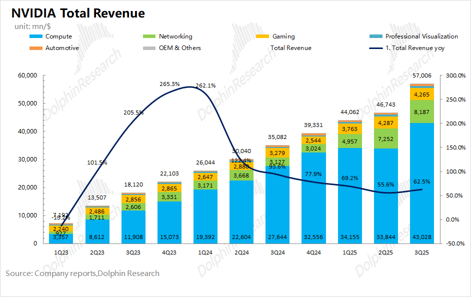 2.1 营业收入:2026财年第三季度(即3Q25)英伟达公司实现营收570亿美元,同比增长62%,市场预期(551亿美元)。公司本季度环比增长的百亿美元,基本上都来自于数据中心业务及Blackwell系列量产爬坡的带动。
