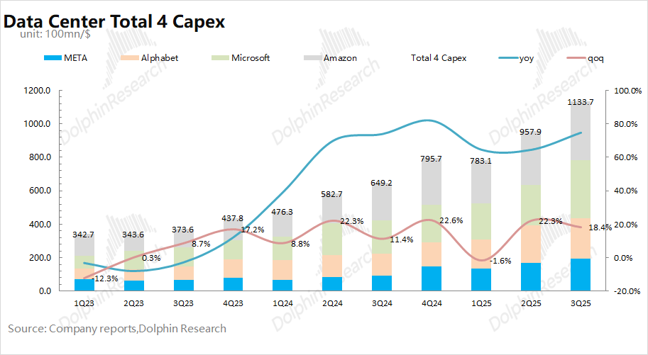 结合各家资本开支及展望,海豚君预计四大核心云厂商(谷歌、Meta、微软和亚马逊)在2026年的资本开支有望提升至5900亿美元,同比增长42%。