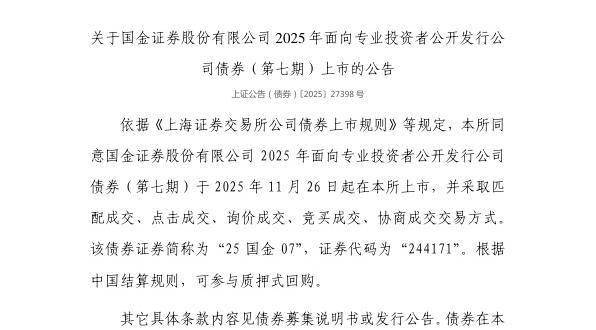 依据《上海证券交易所公司债券上市规则》等规定,上交所同意国金证券股份有限公司2025年面向专业投资者公开发行公司债券(第七期)于2025年11月26日起在上交所上市,并采取匹配成交、点击成交、询价成交、竞买成交、协商成交交易方式。该债券证券简称为“25国金07”,证券代码为“244171”。根据中国结算规则,可参与质押式回购。