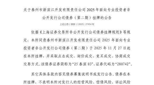 11月26日,上交所发布关于泰州市新滨江开发有限责任公司2025年面向专业投资者非公开发行公司债券(第二期)挂牌的公告。