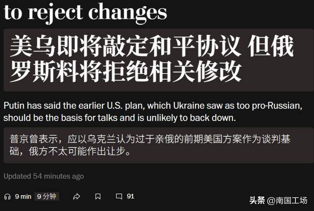 当地时间11月25日,美国媒体“华盛顿邮报”报道称:“美乌即将敲定和平协议,但俄罗斯不太可能接受,美乌正在商谈的新版停战方案的调整内容。”特朗普推出的28条停战协议,俄罗斯都不能同意,何况现在修改过的,至少还得打一年!特朗普推出的28条,俄罗斯总统普京最少觉得还是能谈的,但是这个19条停战协议,基本上是按照欧洲版24/28条改出来的,那就很难谈了。俄罗斯当局现在是希望不要上当,没有俄罗斯参与的和平谈判都不算数,俄军抓紧冬天机会狠狠打击乌军,特别是围歼乌克兰东部集团军,最终实现乌军全部无条件投降。对于乌克兰军队来说,现在被围的乌军部队太多了,很多乌克兰军队都开始自行突围,哪怕是突围中,俄军也是可以降维打击,甚至全歼突围的乌军部队。