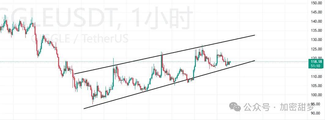 GIGGLE近期要公布销毁了,目前GIGGLE处于上升通道内运行,小级别价格再次回踩下边沿线并未跌破,而且有止跌迹象,所以可以现价118-115区间分批进场多单,预计目标上边沿线130以上。
