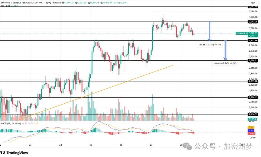 ETH在3043附近形成多重顶回调行情,2977是颈线位置,按照1:1等比回调ETH会在2911附近止跌然后形成反弹,现在的情况 $ETH 会向下测试2911的价格不跌破继续向上突破3050的小压力。