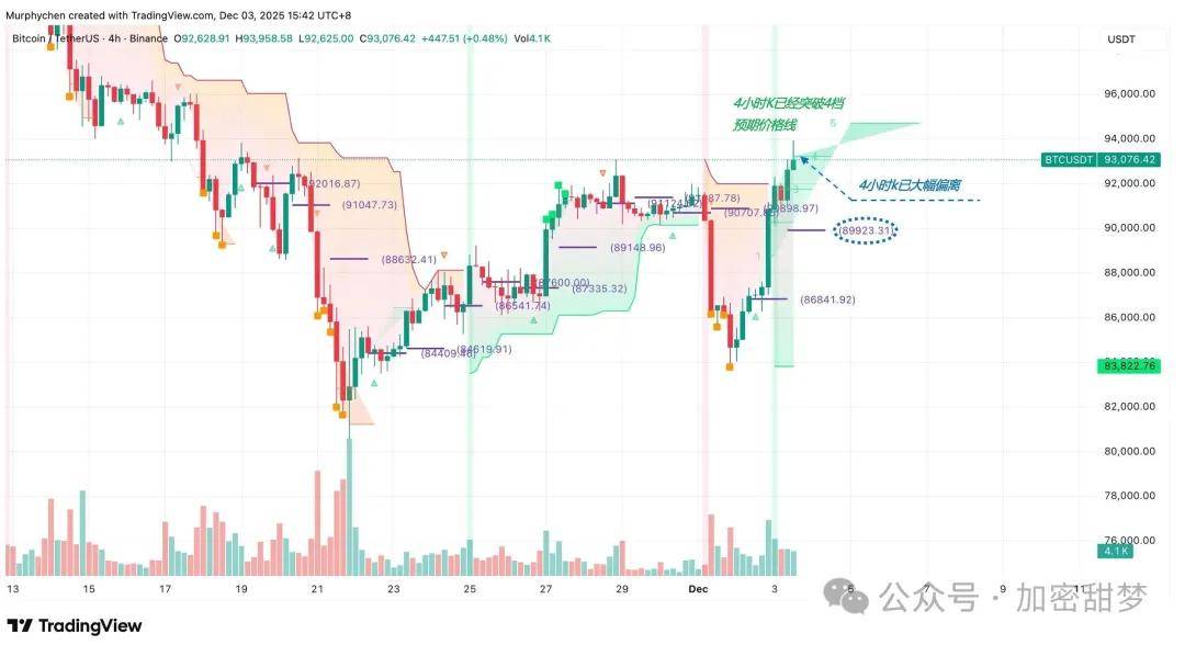 昨天晚上这一波拉盘足够强势,以至于4小时k已经大幅偏离今天指标给出的标准线 $89,923 的位置。因此,至少今天从这里再去追多已不太合适,而且现在价格已触及第4档预期价格线,晚上如要继续强势上攻是有难度的。但只要不跌破$89,923,明天还可以继续顺势找机会。