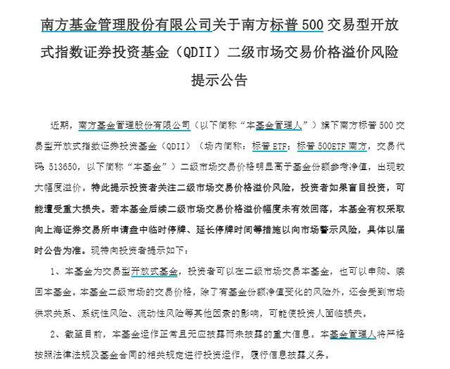 公告显示,标普500ETF南方(513650.SH)二级市场交易价格明显高于基金份额参考净值,出现较大幅度溢价。特此提示投资者关注二级市场交易价格溢价风险,投资者如果盲目投资,可能遭受重大损失。