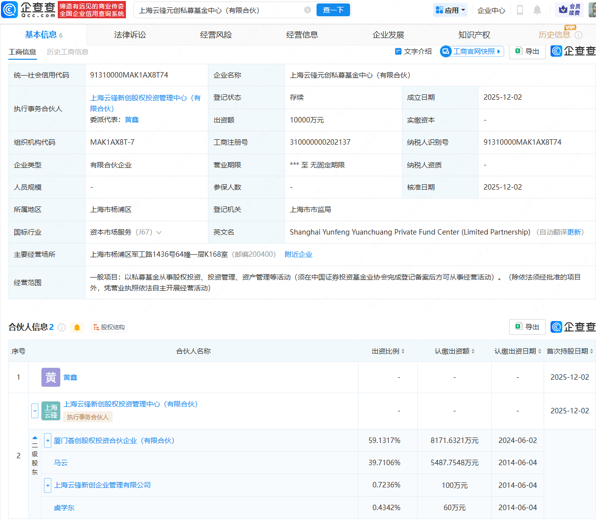 企查查APP显示,近日,上海云锋元创私募基金中心(有限合伙)成立,出资额1亿元,经营范围包含:以私募基金从事股权投资、投资管理、资产管理等活动。企查查股权穿透显示,该企业由黄鑫、马云持股上海云锋新创股权投资管理中心(有限合伙)共同成立。