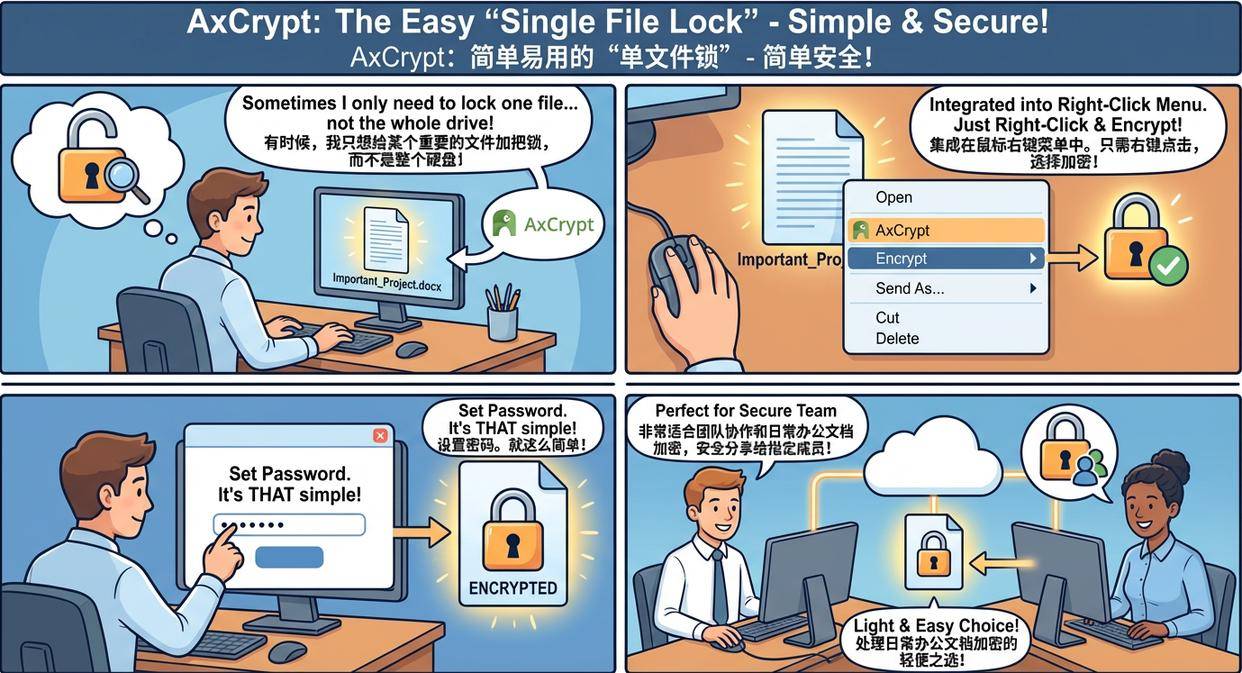 有时候,我们并不需要对整个硬盘加密,只是想给某个重要的文件或文件夹加把锁。该软件就是为此而生。 它的最大特点就是简单易用,安装后直接集成在鼠标右键菜单中。 你只需右键点击文件,选择加密,设置密码即可。它还非常适合团队协作,可以轻松地将加密文件安全地分享给指定成员,是处理日常办公文档加密的轻便之选。