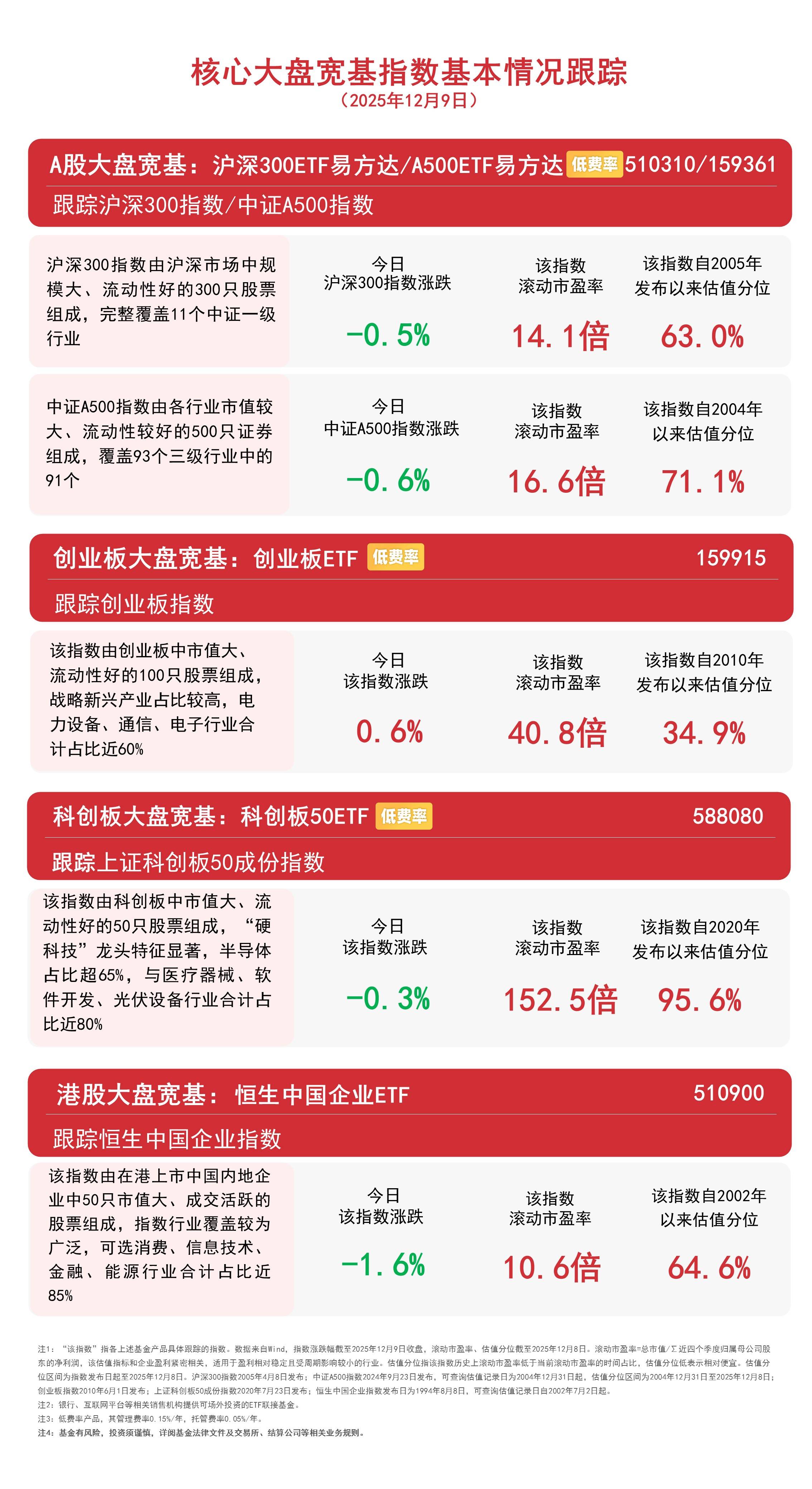 截至收盘,中证A500指数下跌0.6%,沪深300指数下跌0.5%,创业板指数上涨0.6%,上证科创板50成份指数下跌0.3%,恒生中国企业指数下跌1.6%。