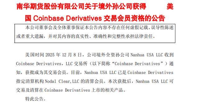 12月9日,南华期货(603093.SH)发布公告称,美国时间2025年12月8日,公司境外全资孙公司 Nanhua USA LLC 收到CoinbaseDerivatives,LLC 交易所(以下简称“Coinbase Derivatives”)通知,获批成为其交易会员。目前,Nanhua USA LLC 已是 Coinbase Derivatives指定清算机构 Nodal Clear,LLC的清算会员。本次获批后,Nanhua USA LLC 可交易及清算在 Coinbase Derivatives 上市的相关产品。