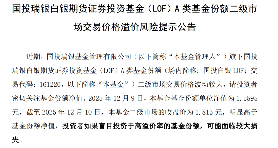 今日盘后,国投瑞银基金发布公告称,国投白银LOF(交易代码:161226)二级市场交易价格波动较大,请投资者密切关注基金份额净值。12月9日,国投白银LOF的基金份额单位净值为1.5595元。截至12月10日,国投白银LOF的二级市场的收盘价为1.815元,明显高于基金份额净值。投资者如果盲目投资于高溢价率的基金份额,可能面临较大损失。
