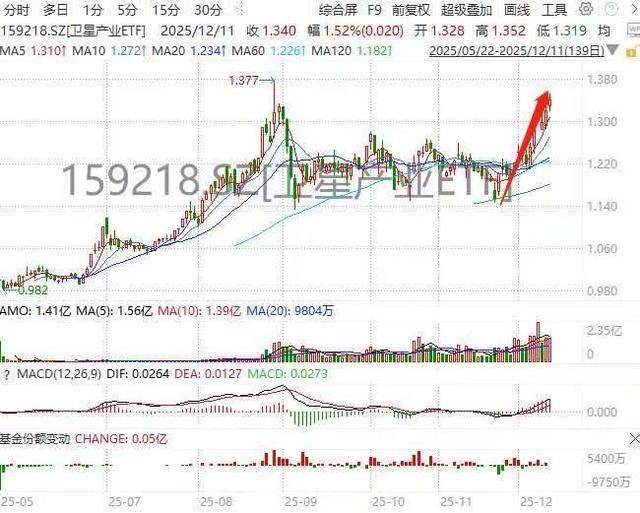 12月11日,卫星板块全天强势。截至14时26分,卫星产业ETF(159218)涨1.52%,盘中价格直逼历史高点。前几大权重股方面,航天电子涨1.40%,中国卫星涨4.89%,中科星图涨1.42%,中国卫通涨1.52%,华测导航跌0.64%;交投持续升温,换手率达18.40%,成交额约1.4亿,资金持续活跃,该基金年内份额扩容426.85%迭创历史新高!