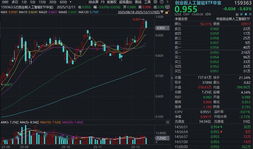 同类对比看,截至12月8日,创业板人工智能ETF华宝(159363)最新规模超33亿元,近1个月日均成交额超6亿元,在跟踪创业板人工智能指数的7只ETF中排行第一!