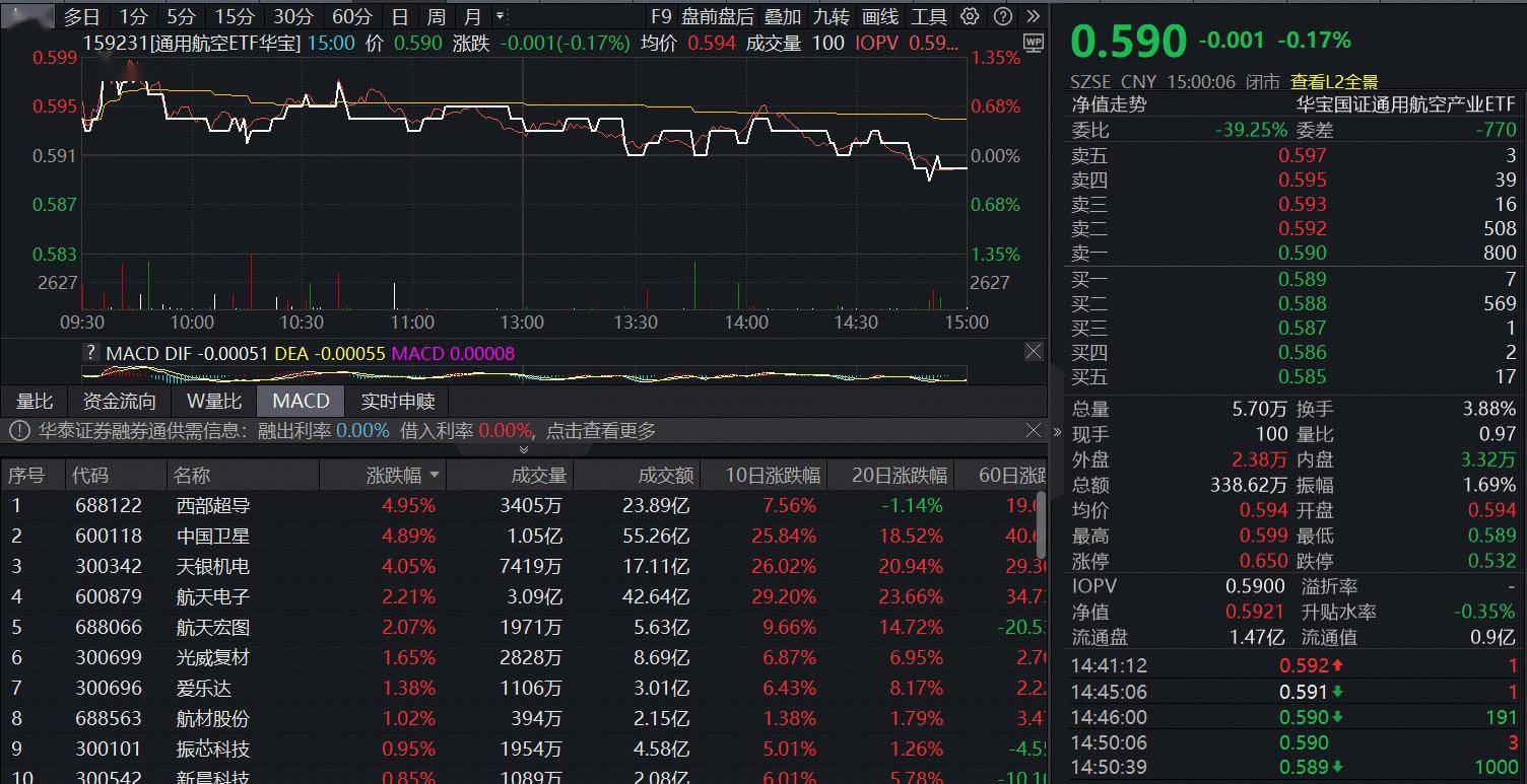 成份股方面,西部超导、中国卫星、天银机电涨超4%居前;广电计量、英搏尔跌超4%,天和防务、晨曦航空跌超3%。万丰奥微、航天彩虹、应流股份等主要权重股跌幅均在1%左右。
