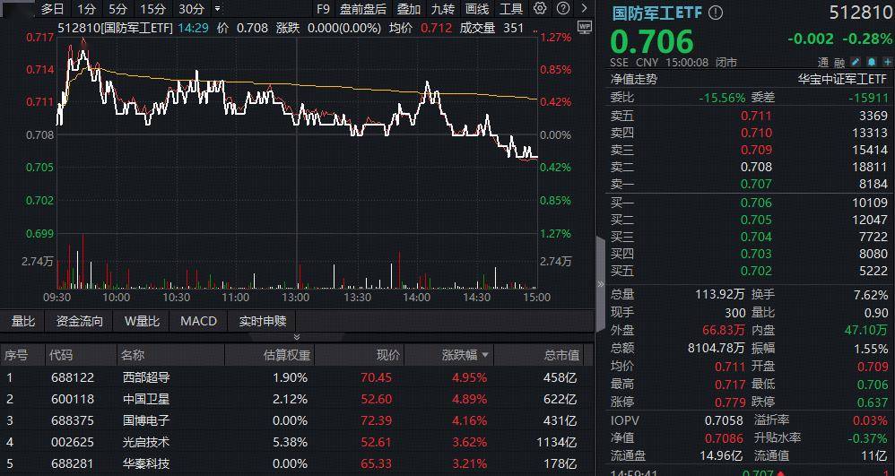 高人气国防军工ETF(512810)汇聚海陆空天军工核心资产,盘初一度涨超1%创阶段新高,而后震荡回落,最终小幅收跌0.28%,表现显著好于大市。全天成交8105万元,较上日放量逾两成。