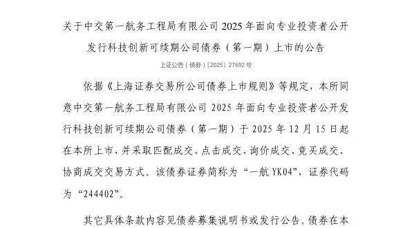 依据《上海证券交易所公司债券上市规则》等规定,上交所同意中交第一航务工程局有限公司2025年面向专业投资者公开发行科技创新可续期公司债券(第一期)于2025年12月15日起在上交所上市,并采取匹配成交、点击成交、询价成交、竞买成交、协商成交交易方式。该债券证券简称为“一航YK04”,证券代码为“244402”。